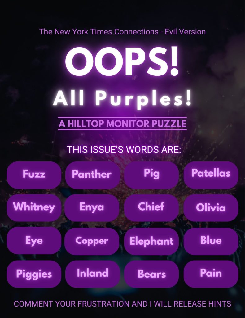 Caption: Oops, All Purples! #4 is here! To solve, divide these sixteen words into four groups of four, each group representing something all four of those words have in common. If you’re confused, try the New York Times Games version for free, and comment to solve or get a hint. Good luck!